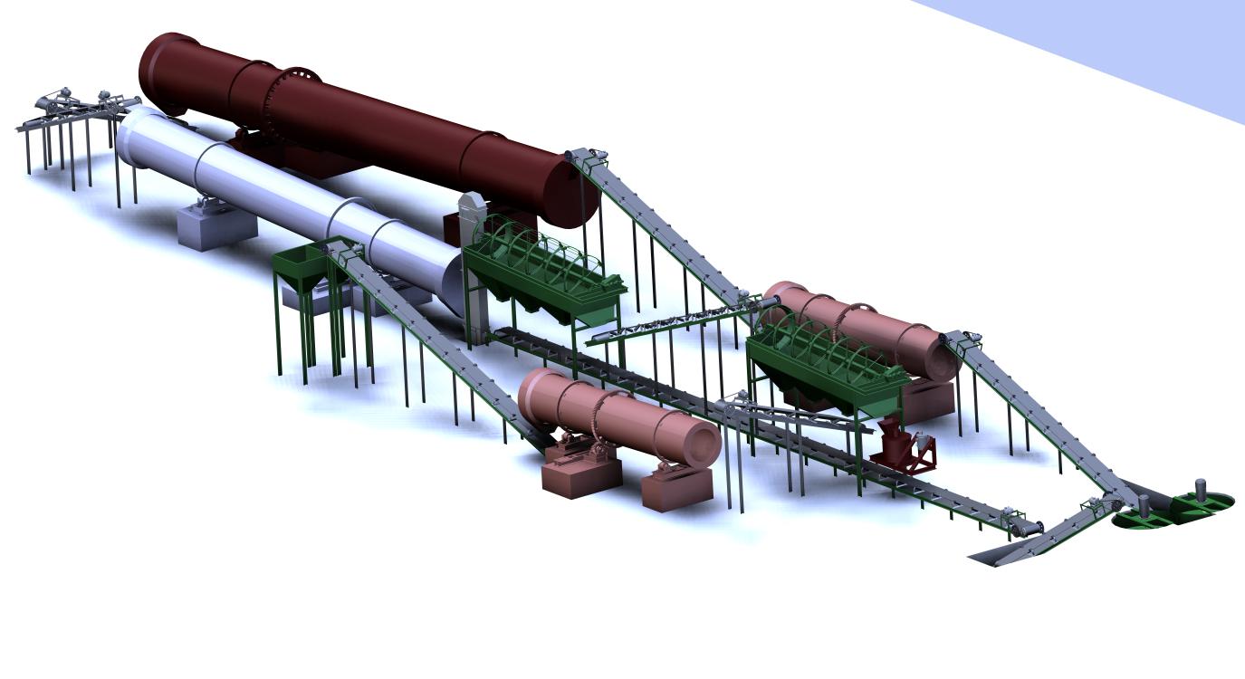 中配置:半湿物料粉碎机、卧式搅拌机、造粒机、烘干机、冷却机、滚筒筛分机、包装设备、皮带输送机等。